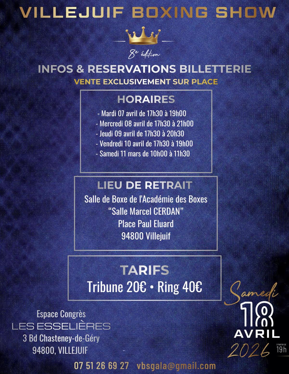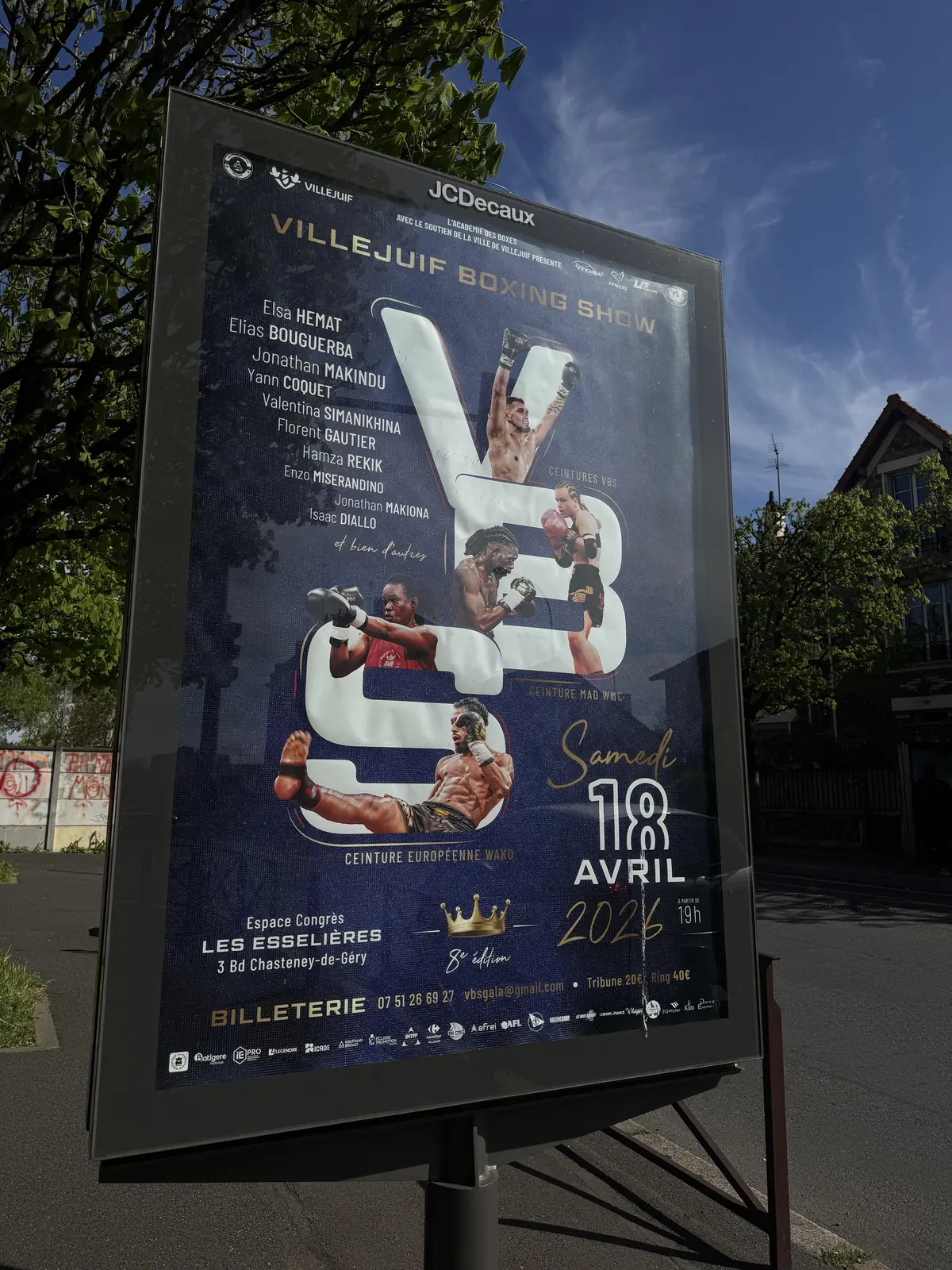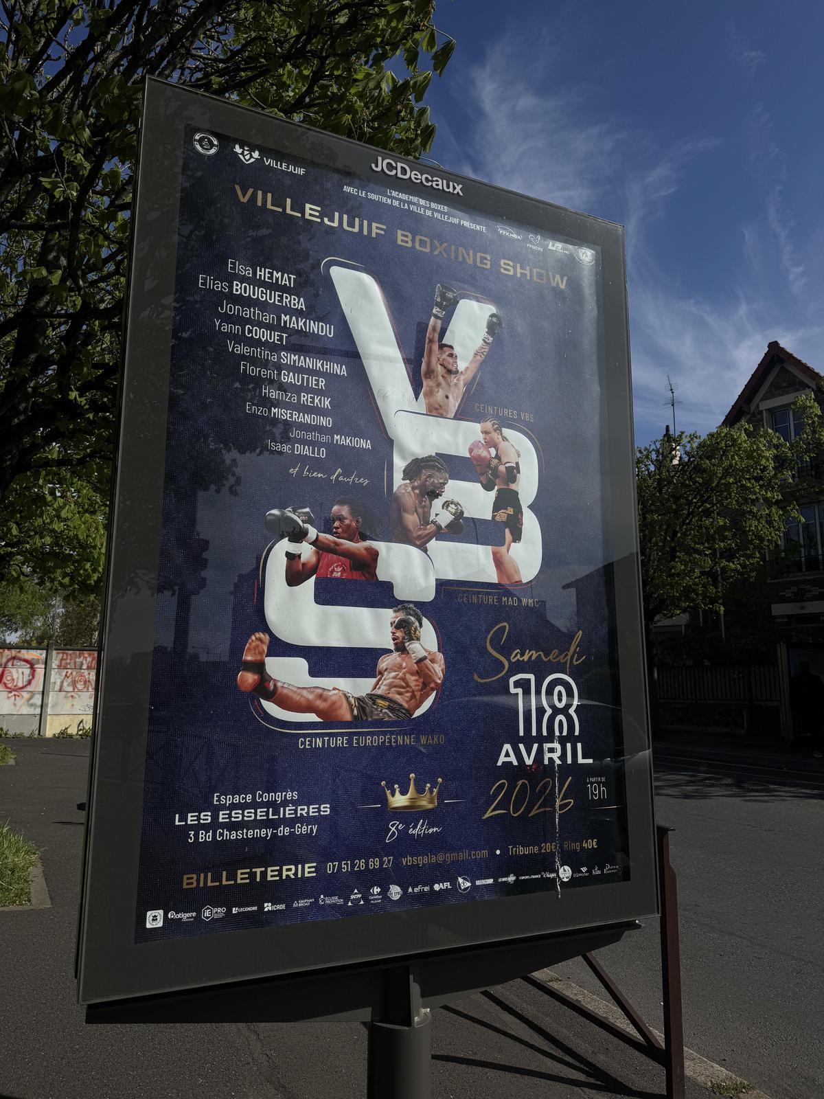 Un immense merci à la Ville de Villejuif pour son soutien indéfectible. Les affiches de la 8ème édition du Villejuif Boxing Show sont désormais visibles sur tous les panneaux de la commune !